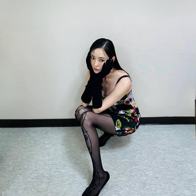 또 다른 사진 속에서는 화려한 꽃무늬 뷔스티에 원피스를 입었습니다.