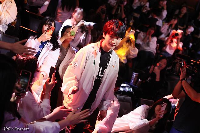 입대 전 마지막 LCK아레나 경기가 될 것 같다던 '피넛' 한왕호는 팬과 손뼉을 맞추며 2025 LCK 플레이오프 승자조 경기에 나섰다.