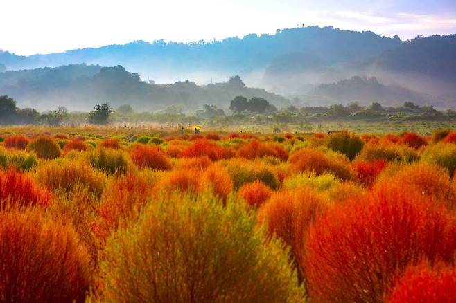 가을철 임진강 변을 따라 댑싸리가 가을의 색으로 물들며 장관을 이루는 연천 가볼 만한 곳입니다. 댑싸리 외에도 황화 코스모스, 국화, 백일홍, 천일홍 등 다양한 가을꽃을 함께할 수 있는데요.