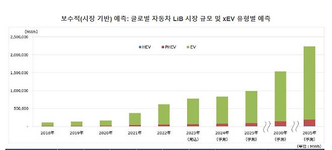 긍정적인 전망에서는 전 세계적으로 환경 규제가 강화되는 추세, 세계 각국 정부의 추진 정책, 이에 따른 자동차 제조사의 전동화로의 전환 등을 배경으로 각국 정부가 도입하는 전동화차의 목표 대수가 계획대로 실현되고 성장률이 상대적으로 높다고 가정했다. 이 관점에서 전 세계 자동차 리튬이온 시장은 2025년 1,248GWh, 2030년 2,241GWh, 2035년 3,614GWh가 될 것으로 전망했다.