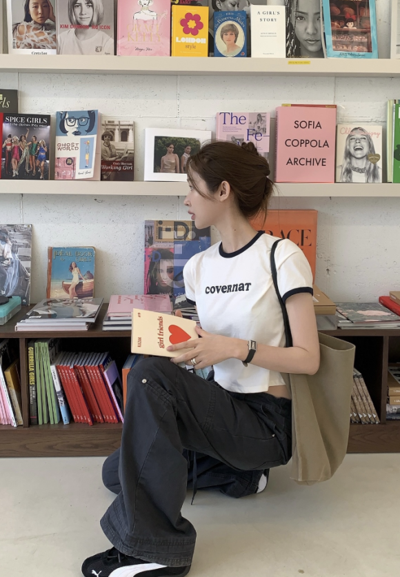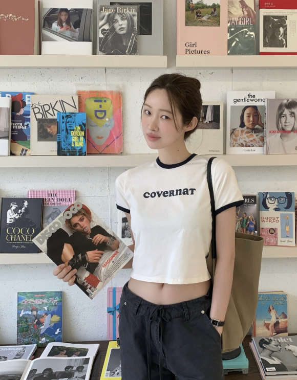 그녀가 착용한 제품은 국내 스트리트 캐주얼 브랜드 COVERNAT(커버낫)의 우먼 크롭 쿠퍼로고 링거 티셔츠다.