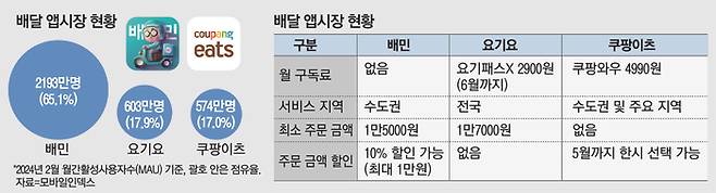 지난달 쿠팡이츠가 쿠팡와우 회원을 대상으로 '무제한 무료 배달' 서비스를 시작하자 점유율 1위 배달의민족이 1일부터 배달비 무료 서비스를 내놓으면서 맞불을 놓은 것이다.