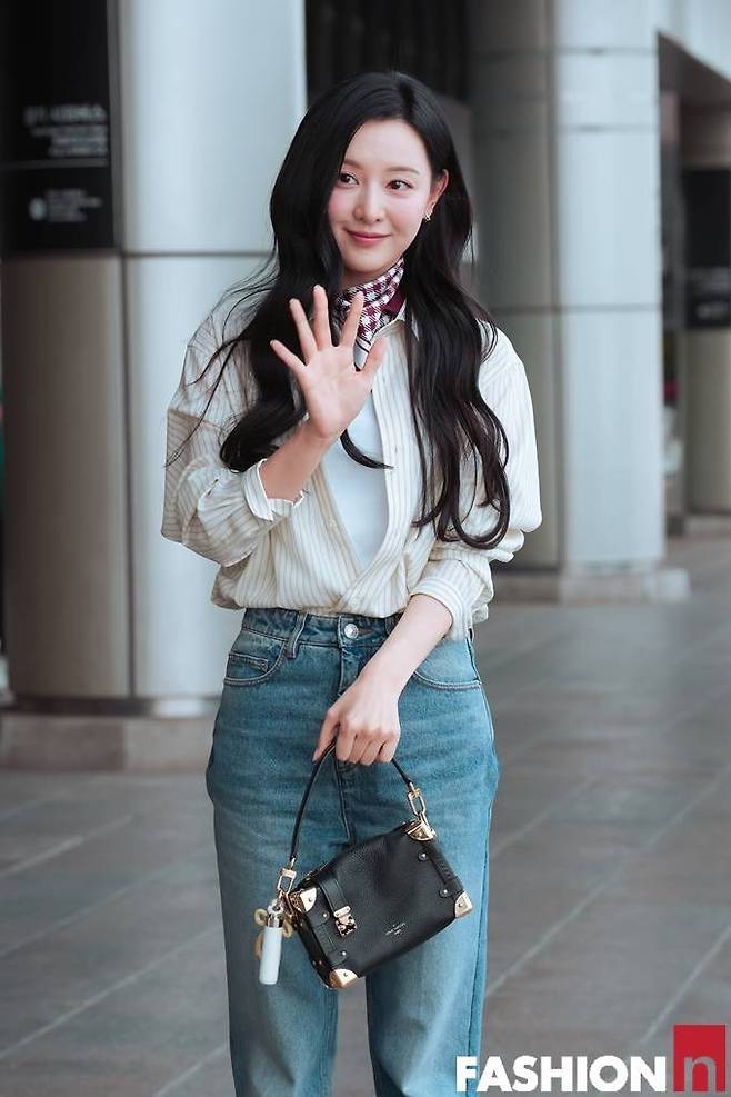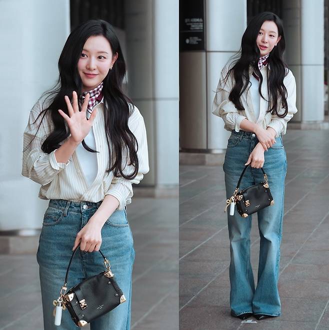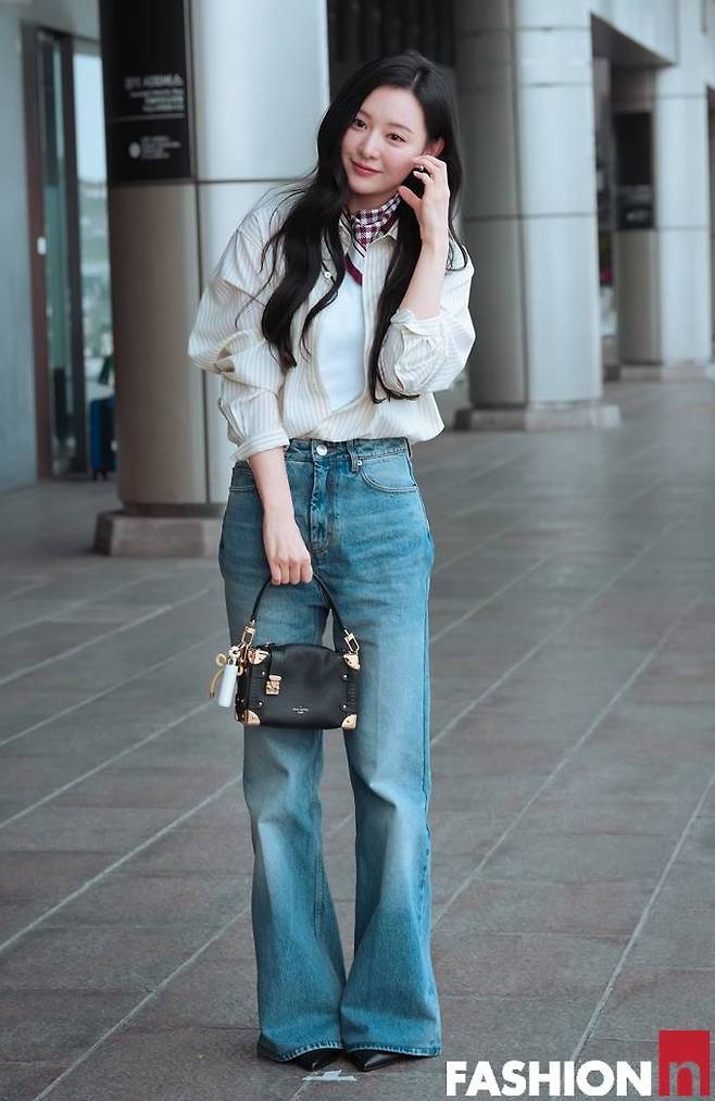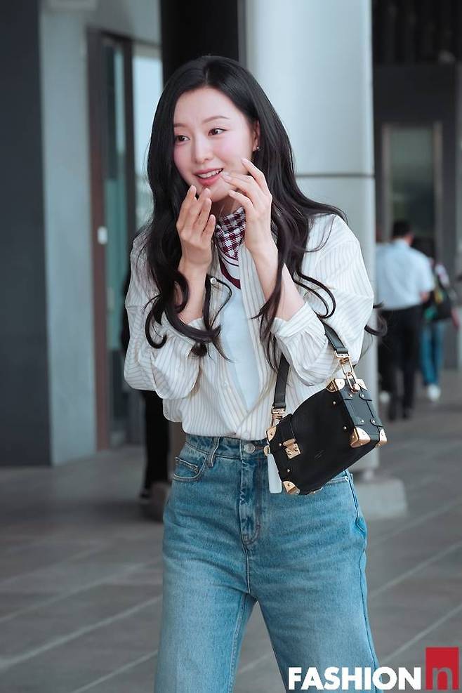 배우 김지원이 쁘띠 스카프와 단추 푼 셔츠로 감각적인 출국룩을 선보였다.