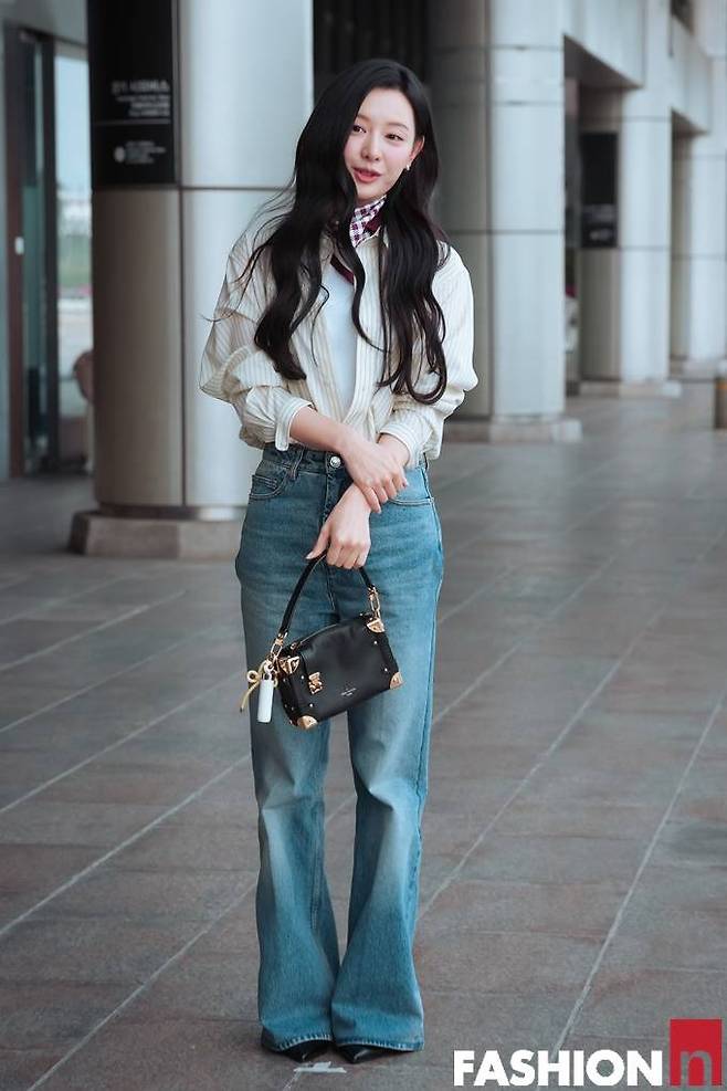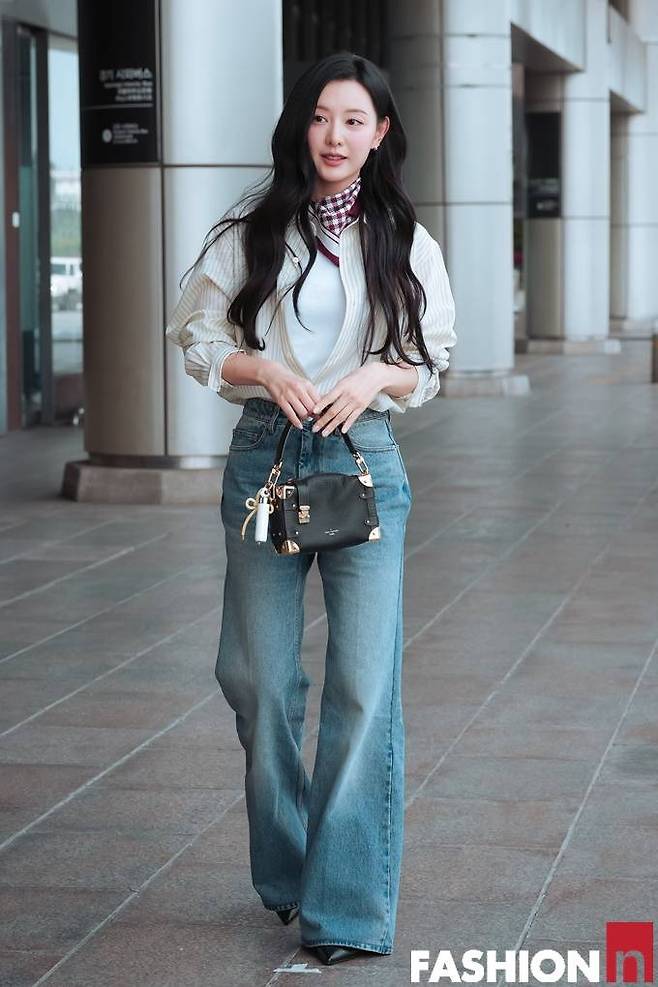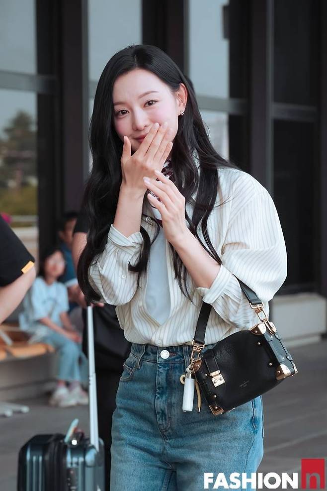 이날 김지원은 체크 쁘띠 스카프에 데님 팬츠와 화이트 티셔츠를 입고 그 위에 단추를 푸른 스트라이프 셔츠를 걸친 출국룩으로 감각적이면서도 러블리한 스타일을 완성했다.
