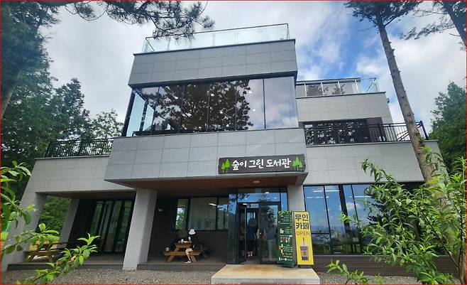 갈모봉 산행의 즐거움 중 하나는 2024년 새롭게 문을 연 ‘숲이 그린 도서관’입니다. 총사업비 50억 원이 투입된 산림 복지 시설의 핵심인 이곳은 1층 무인카페에서 셀프 음료를 구매해 2층과 루프탑에서 자란만 전경을 바라보며 독서를 즐길 수 있는 특별한 쉼터입니다.