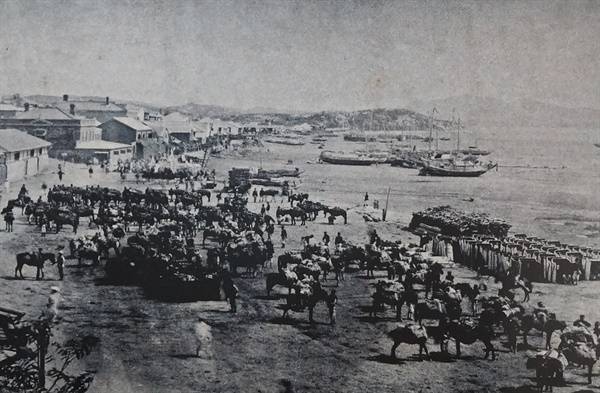 | ▲ 제물포에 상륙한 일본군 1894년 6월 13일, 인천 제물포에 도착한 와카노우라 마루와 일본 혼성여단의 선발대대. 청군이 동학군 빔압을 구실삼아 조선에 들어오자 일본은 그 다음날 제1군 사령부 및 제3사단 주력과 후속부대를 조선에 상륙시켰다. 일본군은 청군을 물리친 뒤 동학군 소탕에 나섰다. 이 사진은 동학혁명기념관에 전시되었다. |
