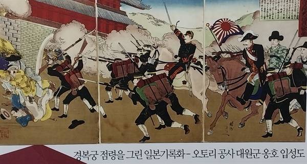 | ▲ 경복궁점령 일본기록화 1894년 6월 21일(양7.23) 일본군은 새벽 경복궁을 불법 기습 점령하였다. 조선 궁궐 침공은 일본 공사 오토리의 지휘 아래 일본군 제5사단 혼성여단장 오시마 요시마사의 출동 명령에 의한 용산에 주둔해 있던 2개 연대가 동원되었다. 이 사진은 현재 동학혁명기념관에 전시중이다. |