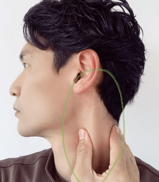 목 양측 흉쇄유돌근 마사지(귀밑→쇄골 10회 반복). 림프배농 300%↑, 부종 40%↓.