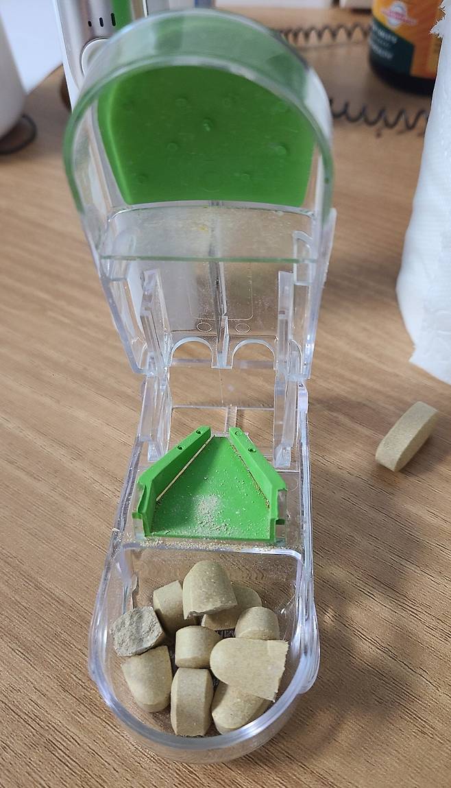 1000mg 비타민c를 반으로 잘라 먹고 있는데 컷팅기 구석마다 가루가 묻고 깨끗이 닦기가 구조적으로 불가능.