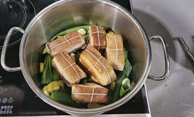 적당히 노릇해진 오겹살을 요리용 실로 묶어줍니다.