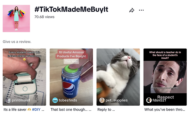 실제로 영상 콘텐츠를 통해 제품 정보를 접하고, 해당 제품에 관심을 갖게 되는 경우가 늘어나고 있습니다. 하나의 트렌드가 되고 있는데요. 틱톡에서 ‘틱톡 보고 샀다(#TikTokMadeMeBuyIt)’라는 태그가 대표적인 예시입니다. 이 태그가 인기를 얻으면서 706억 회가 넘는 조회수를 기록하며 사용자들에게 상품을 구매하게 만드는 요인이 되고 있습니다. 아마존에서 구매할 수 있는 상품을 추천하는 #AmazonFinds라는 태그도 조회수가 611억 회를 기록하고 있죠.