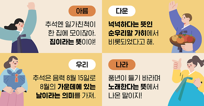 Q. 추석의 다른 말인 '한가위'와 '가배'는 같은 어원에서 나온 단어입니다. 공통된 어원의 뜻을 바르게 설명한 사람은 누구일까요?