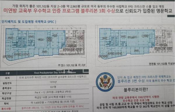 이 단지 수분양자들에 따르면 당시 분양대행사와 시행사는 ‘미국에서 블루리본을 3번 수상한 이력과 미국 동부의 우수학교로 선정된 명문국제학교인 FPD 크리스챤 스쿨이 들어올 예정이고, 단지 내 입주자들의 자녀가 우선 입학한다’는 홍보 문구를 사용했다.