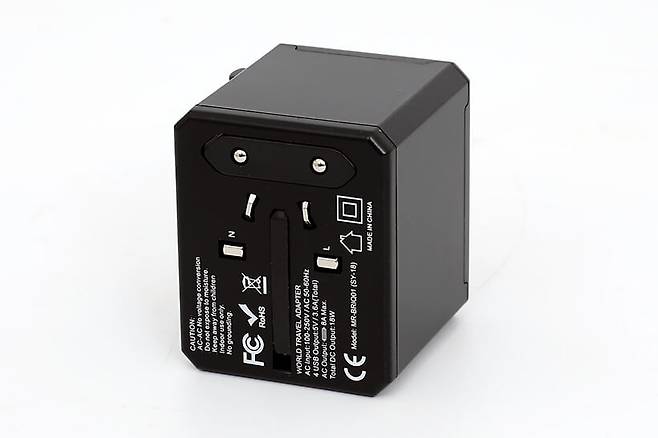 멀티 콘센트 반대편에는 멀티 콘센트에 끼울 수 있는 모든 형태의 플러그 핀이 내장된 것이 살짝 보이며, 각종 인증 마크도 확인할 수 있다.