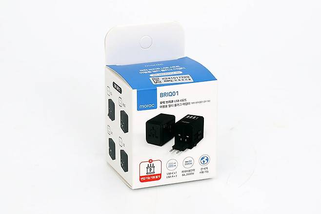 모락 브리큐 USB 4포트 여행용 멀티 플러그 어댑터 MR-BRIQ01은 자그마한 상자에 담겨 있다. 상자에는 제품 이미지와 사용법 등이 자세하게 인쇄되어 있다.