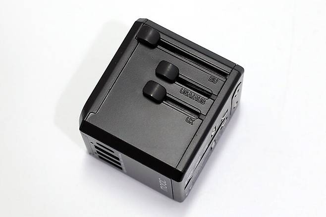 모락 브리큐 USB 4포트 여행용 멀티 플러그 어댑터 MR-BRIQ01의 슬라이딩 노브 부분을 자세히 보면 홈 아래에 플러그 핀 형태를 사용할 수 있는 대표적인 국가가 표시되어 있다. 제일 위쪽은 유럽연합, 다음은 미국과 호주, 제일 아래는 영국이다.