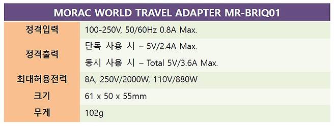 모락 브리큐 USB 4포트 여행용 멀티 플러그 어댑터 MR-BRIQ01은 멀티 플러그 어댑터 기능으로 전 세계 어딜 가든 내가 가지고 있는 가전 기기를 연결해 쓸 수 있다. 여기에 4포트 USB 충전기의 기능까지 합해 스마트폰이나 액션캠, 이어폰 등 충전이 필요한 기기의 충전기를 따로 챙겨야 하는 번거로움까지 없애주어서 해외여행의 필수품이라고 할 수 있다. 이러한 다양한 기능을 하나에 담고 있지만 크기는 일반 여행용 멀티 플러그 어댑터와 크게 다르지 않은 자그마한 크기와 가벼운 무게로 휴대성까지 갖춰서 상당히 유용하게 쓰일 수 있을 것으로 보인다.
