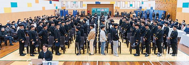 | ▲ 경남해양과학고등학교가 올해부터 협약형 특성화고등학교로 개교했다. 이를 기념하는 개교식이 지난 4일 경남해양과학고등학교 체육관에서 열렸다. 신입생과 재학생들이 서로 인사를 하고 있다. |