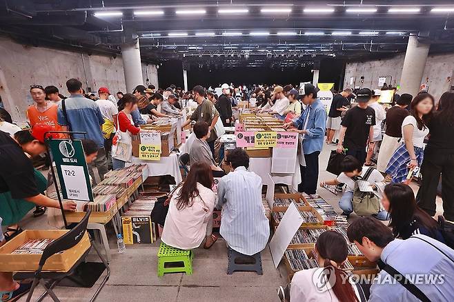 (서울=연합뉴스) 진연수 기자 = 22일 서울 마포구 문화비축기지에서 열린 LP 음반축제 '제13회 서울레코드페어'를 찾은 시민들이 음반을 살펴보고 있다. 2024.9.22