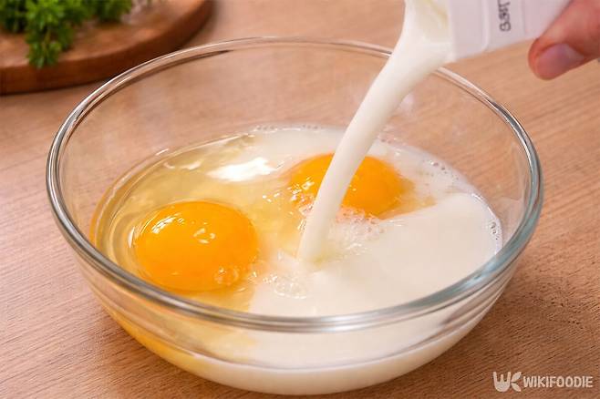 그다음 그릇에 계란 2알과 우유 100ml, 설탕 1큰술, 소금 한 꼬집을 넣어 잘 섞는다. 이때 바닐라 익스트랙을 조금 넣으면 계란의 비린 맛을 잡고 풍미를 높일 수 있다.