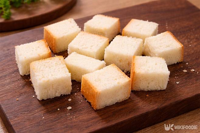 1. 식빵 2장의 가장자리를 잘라낸 뒤 한입에 먹기 좋은 크기로 자른다.