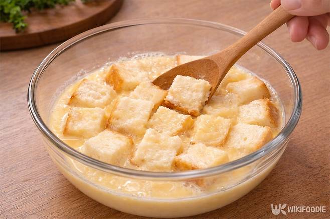 프렌치토스트는 본래 딱딱해진 빵을 맛있게 먹기 위해 시작된 요리인 만큼, 계란물을 머금은 빵은 이전보다 훨씬 부드러운 상태로 바뀐다. 빵을 앞뒤로 뒤집어가며 계란물을 듬뿍 묻힌다.