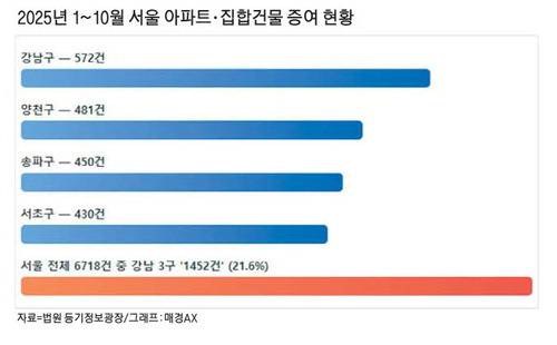 법원에서 발표한 2025년 서울의 아파트 등 집합건물의 증여건수가 2023년에는 6,011건, 2024년에는 6,549건이었던 것이 2025년에는 8,451건으로 전년대비 29%나 증가하였다.