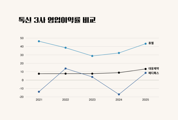 반면 대웅제약은 △2021년 7.6% △2022년 7.7% △2023년 7.7% △2024년 8.9% △2025년 13.3%로 안정적인 성장세를 보였다. 휴젤도 △2021년 46.2% △2022년 38.5% △2023년 28.8% △2024년 32.3% △2025년 43.3%로 앞서고 있다. 메디톡스는 경쟁사 대비 이익률 수치의 변동성에서 취약했다.
