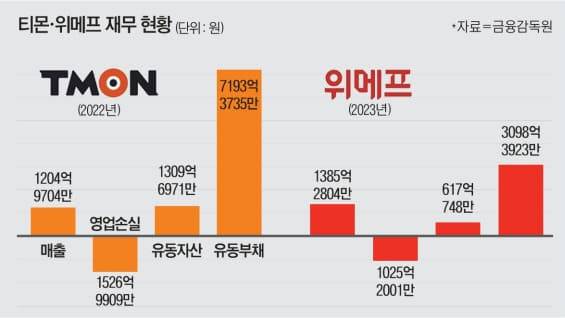 금융감독원 전자공시시스템에 따르면 티몬의 지난 2022년 기준 자본총액은 -6386억원입니다. 1년 이내 현금화할 수 있는 유동자산은 1309억 원으로 전년보다 22% 줄었줄었습니다. 2021년 기준 555억 원이던 현금(보통예금)은 2022년 80억 원으로 감소했습니다. 지급보증서 발급을 위한 담보가 잡혀있는 16억 원은 쓸 수 없는 상태입니다. 위메프도 2022년 기준 자본총액은 -2398억원으로 자본잠식 상태입니다.