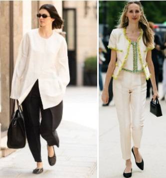 블랙 니트 톱 + 화이트 팬츠 + 포인티드 플랫 – 모던 오피스룩
