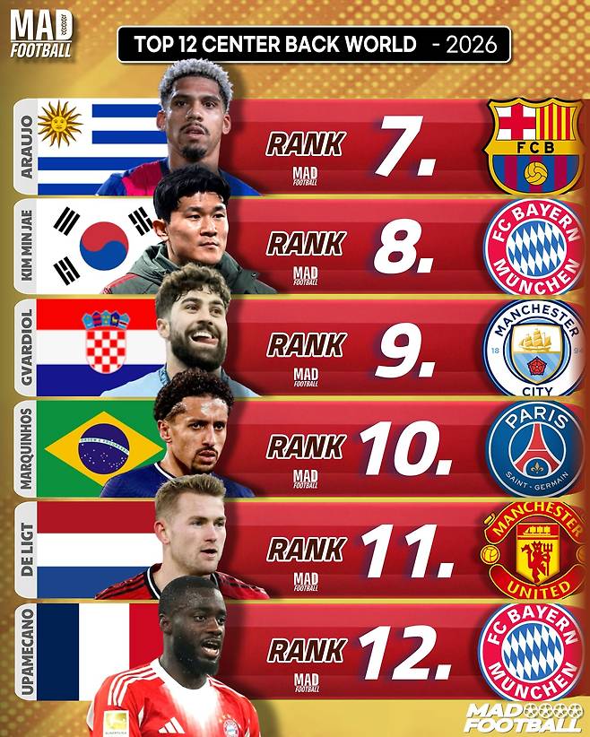 글로벌 축구 콘텐츠 매체 '매드 풋볼'은 15일(한국시간) 2025-2026시즌 현재 세계 최고의 센터백 상위 12명을 선정해 발표했다.