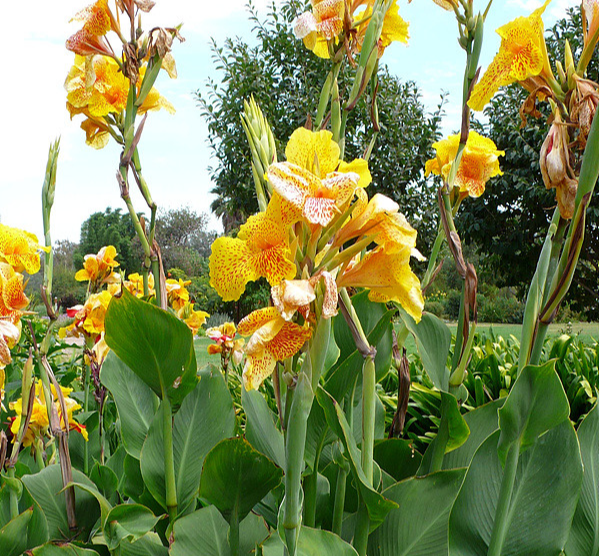 칸나는 넓은 잎이 동남아 고향인 관엽류처럼 느껴지는 이국적인 초화구근류다. 꽃도 아름다워 이런 저런 모듬화단의 배경이나 자동차가 다니는 도로 화단에서 널리 사랑받는다.
