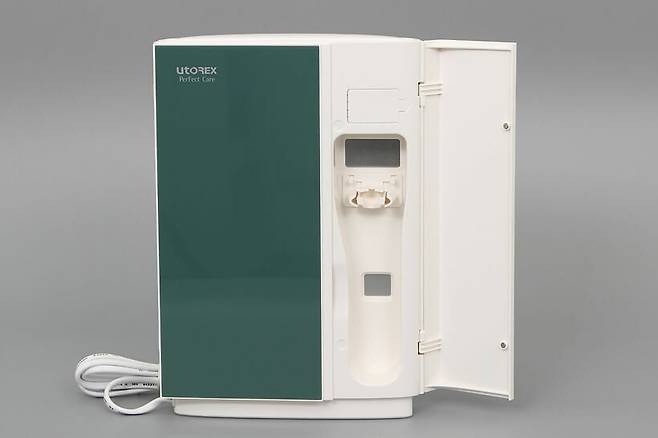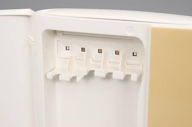 유토렉스 퍼펙트케어 그리드컬렉션 UV-C 히팅 칫솔살균기는 외형도 그렇지만, 도어도 요즘 냉장고처럼 2도어로 이루어져 있다. 왼쪽의 큰 도어 안쪽은 칫솔 룸으로, 최대 다섯 개의 칫솔을 동시에 거치할 수 있다.