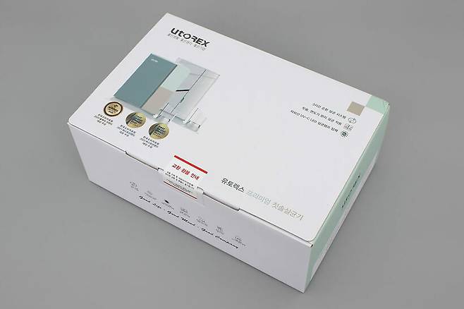 유토렉스 퍼펙트케어 그리드컬렉션 UV-C 히팅 칫솔살균기는 흰색 박스에 담겨있다. 일부 모델이 함께 사용하는 박스이기 때문에 박스 윗면에는 약간 다르게 생긴 모델까지 함께 인쇄되어있다.