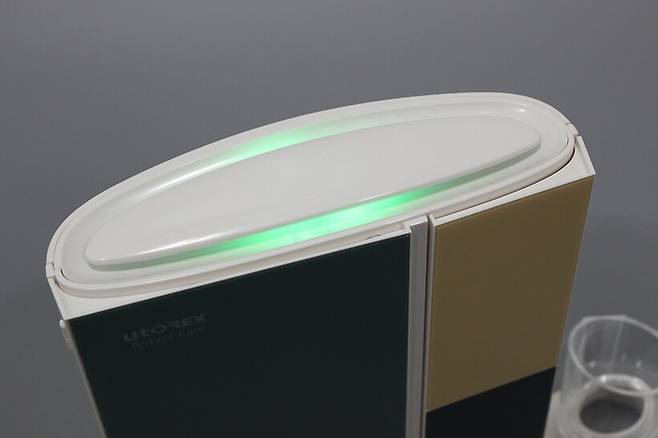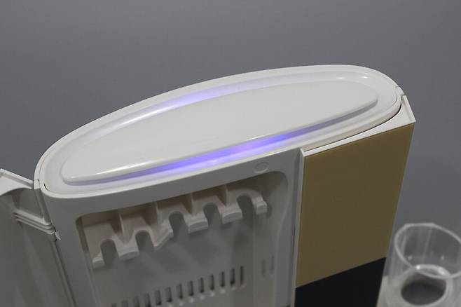 전원을 연결하면 본체 윗면에 은은한 LED 무드등이 켜진다. UV 살균이 진행되고 있을 때는 LED 색상이 녹색으로 켜지며, UV 살균이 종료된 후나 도어를 열었을 때에는 LED가 푸른색으로 바뀐다.