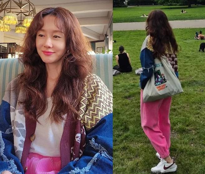 공개한 사진에서 김지수는 핑크 팬츠에 데님과 니트 믹스의 카디건을 걸친 데일리룩으로 자연스러우면서도 편안한 여행 스타일을 선보였다.