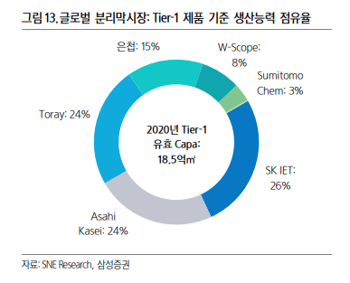 SK아이이테크놀로지의 현 시가총액은 5조4614억원 가량이고요. 글로벌 분리막 생산능력 점유율은 26%(더블유씨피 : 8%)에 달합니다. 어느 면에서보나 SK아이이테크놀로지보다 한참 아래일 것 같은 더블유씨피가 SK아이이테크놀로지 기업가치의 62%로 평가된다니 놀라울 수 밖에 없습니다.
