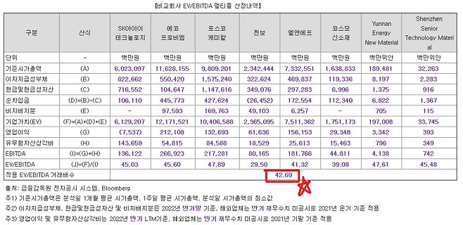 위 표를 보면 비교기업들(SK아이이테크놀로지, 에코프로비엠, 포스코케미칼, 천보, 엘앤에프, 코스모신소재, 중국업체들)의 에비타멀티플이 대부분 45배 전후에서 형성돼 있어요.
