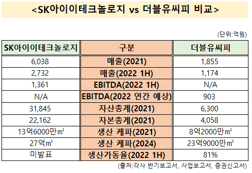 생산능력과 현금창출능력은 SK아이이테크놀로지를 잘 따라잡았는데 전반적인 기업 규모 면에서는 절반에도 못미치는 모습을 보여주고 있는 기업이 더블유씨피인거죠.