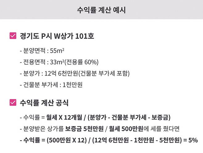 현재 시중금리와 비교해보면 어떨까? 요즘 은행 금리는 세전으로 3% 초반인데, 신축 상가 분양을 할 때는 보통 4~5%의 수익률을 보장한다면서 홍보한다. 일부 비수도권이나 수도권 내 입지가 애매한 곳에서는 6~7%의 수익률을 내세우며 소비자들을 유혹하기도 한다. 겉으로 보기에는 은행 이자보다 높은 수익률을 보장하는 듯하지만, 문제는 이 계산이 실제 시장 상황과 맞아떨어지지 않는 경우가 많다는 점이다.