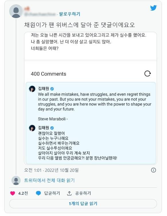 이에 김채원은 "괜찮아요. 잘했어. 실수는 누구나 해요. 실수하면서 배우는 거에요. 저도 실수투성이에요. 살아야지, 살아야 우리 계속 보지"라는 댓글을 달아 팬을 응원했다.