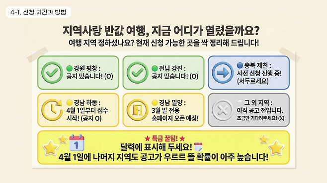 봄나들이 가기 좋은 계절이 돌아왔습니다. 여행 경비의 50%를 현금처럼 쓰는 상품권으로 돌려받을 수 있는 지원금을 소개합니다. 유튜브 채널 ‘엄마아빠 정보독립시대’에서 여행비를 아끼며 떠나는 ‘지역 사랑 휴가 지원’ 사업과 봄나들이 가기 좋은 지역 축제 5곳을 정리했습니다. ‘엄마아빠 정보독립시대’는 부모 세대를 위한 디지털·생활 정보를 쏙쏙 뽑아 전달하는 프로그램입니다.