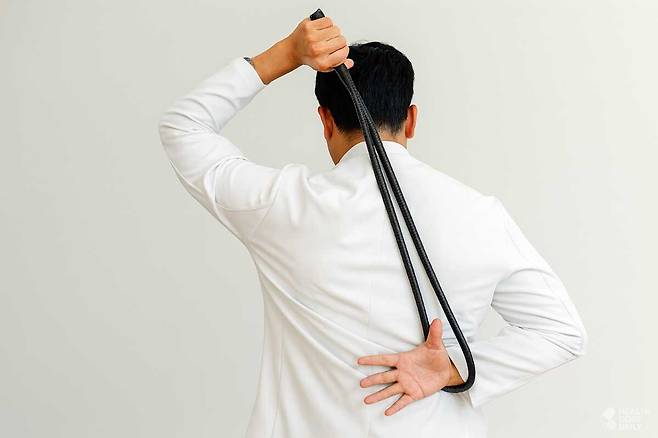 ‘등을 긁기 어렵다’는 말은 단순한 유연성 부족이 아니다. 팔을 등 뒤로 보내는 내회전 동작이 잘 안 되기 때문이다. 이럴 때는 수건이나 벨트처럼 늘어나지 않는 끈을 이용한 스트레칭이 효과적이다. 끈의 한쪽을 건강한 손으로 위에서 잡고, 아픈 팔은 아래에서 손목에 걸친다. 주먹을 쥐지 말고 손을 걸치는 정도로만 힘을 빼는 것이 중요하다.