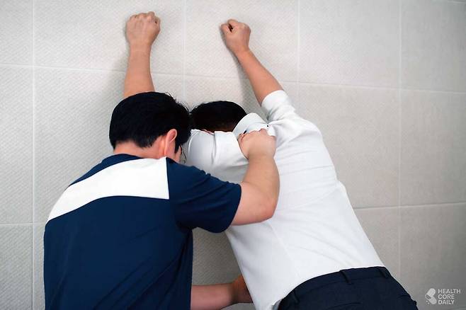 1) 팔을 90도 굽혀 벽에 손을 댄다