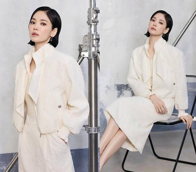 배우 송혜교가 아이보리 톤의 셋업 룩으로 미니멀한 톤온톤 스타일링을 보여줬습니다.