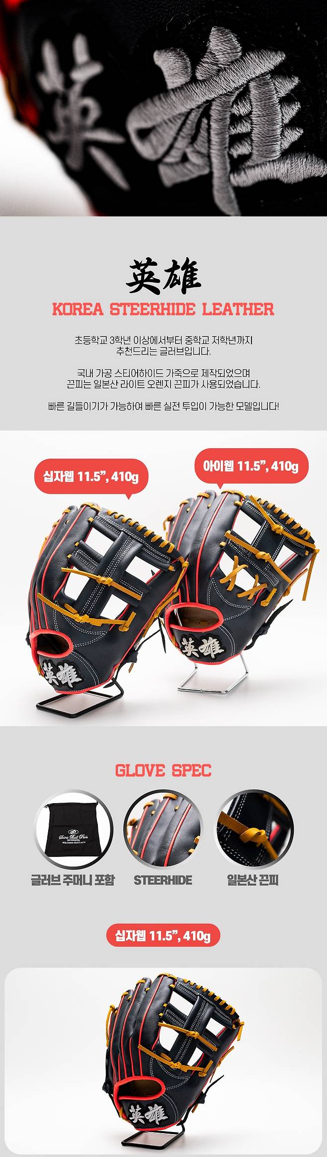 SBP 영웅 KOREA STEERHIDE 주니어 유소년 글러브 11.5 다크네이비 2종