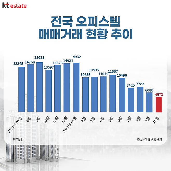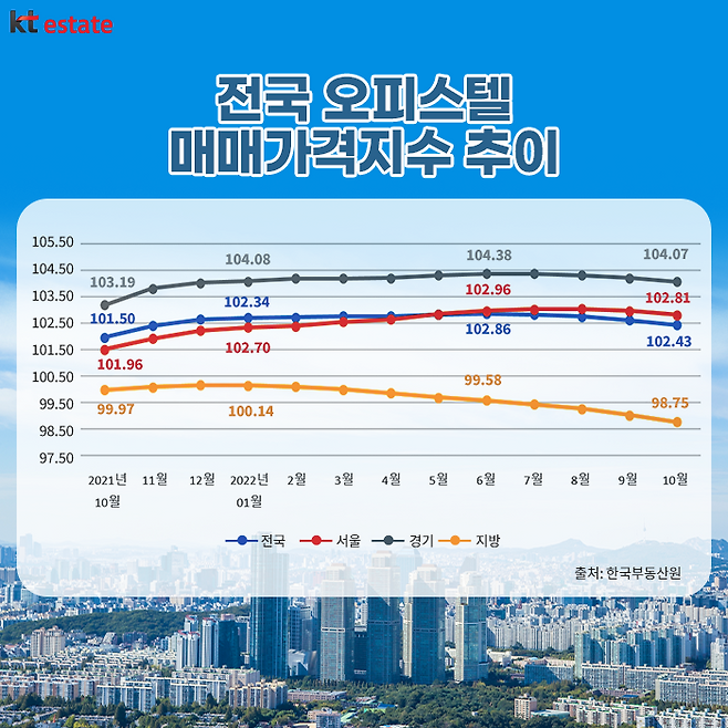 부동산 경기 침체에 오피스텔시장 또한 찬 바람이 불고 있습니다. 한국부동산원 오피스텔 가격동향조사에 따르면 전국 오피스텔 매매가격지수는 올해 중순을 기점으로 하락세를 기록해 10월에는 102.43으로 올해 6월 대비 -0.43p 내렸습니다. 서울은 -0.15p 하락했으며, 경기 -0.31p, 그리고 지방은 -0.83p 하락했습니다.