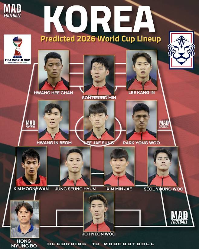 글로벌 축구 콘텐츠 매체 '매드풋볼'은 10일(한국시간) 2026 북중미 월드컵에서 좋은 성적을 거둘 상위 18개 팀의 예상 선발 라인업을 전망했는데 여기에 대한민국이 포함됐다.