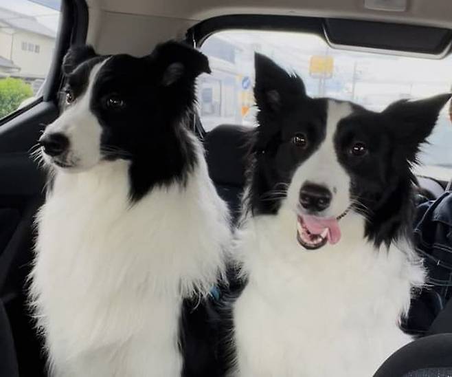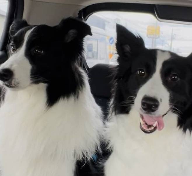 여기 보더콜리 강아지들을 차량에 태우고 어디론가 향하는 집사가 있습니다. 그런데 누가 봐도 두 강아지 표정이 차이를 보이는 것 아니겠습니까.