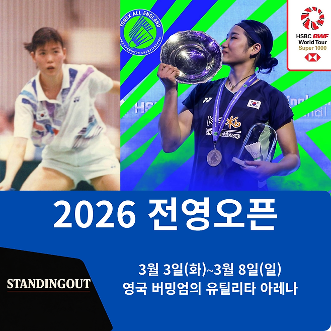 [스탠딩아웃]=영국 버밍엄의 유틸리타 아레나는 배드민턴 종목의 품격과 정통성을 상징하는 성지다. 1899년 시작된 전영오픈(All England Open)의 시상대 맨 위 칸은 역사가 선택한 소수에게만 허락되는 특권이다. 2026년 3월, 세계 랭킹 1위 안세영이 다시 이 차가운 코트 위에 선다. 그녀의 시선은 단순한 우승 횟수를 넘어, 한국 단식 역사상 그 누구도 도달하지 못한 '대회 2연패'라는 실질적인 권위를 향하고 있다.
